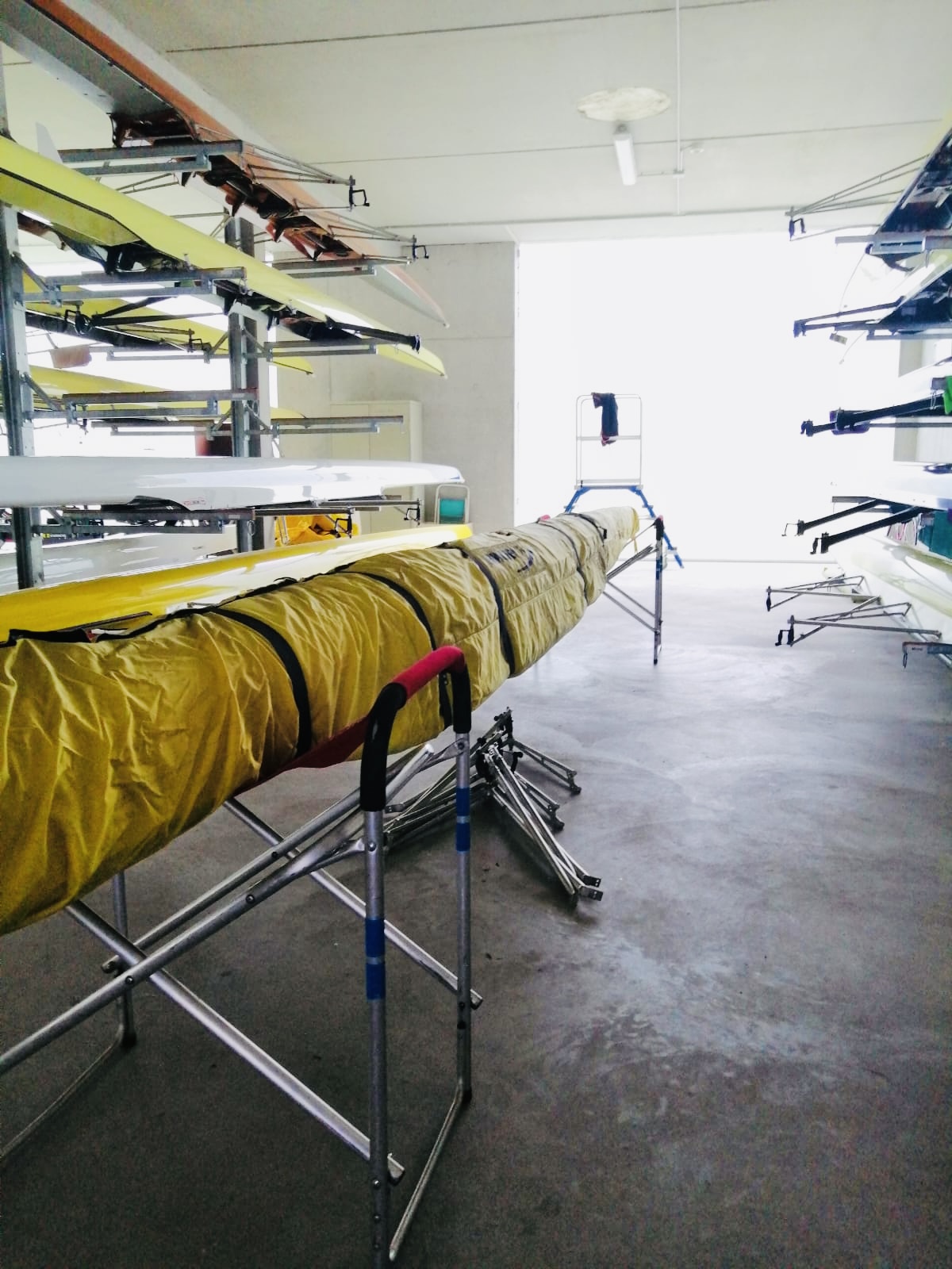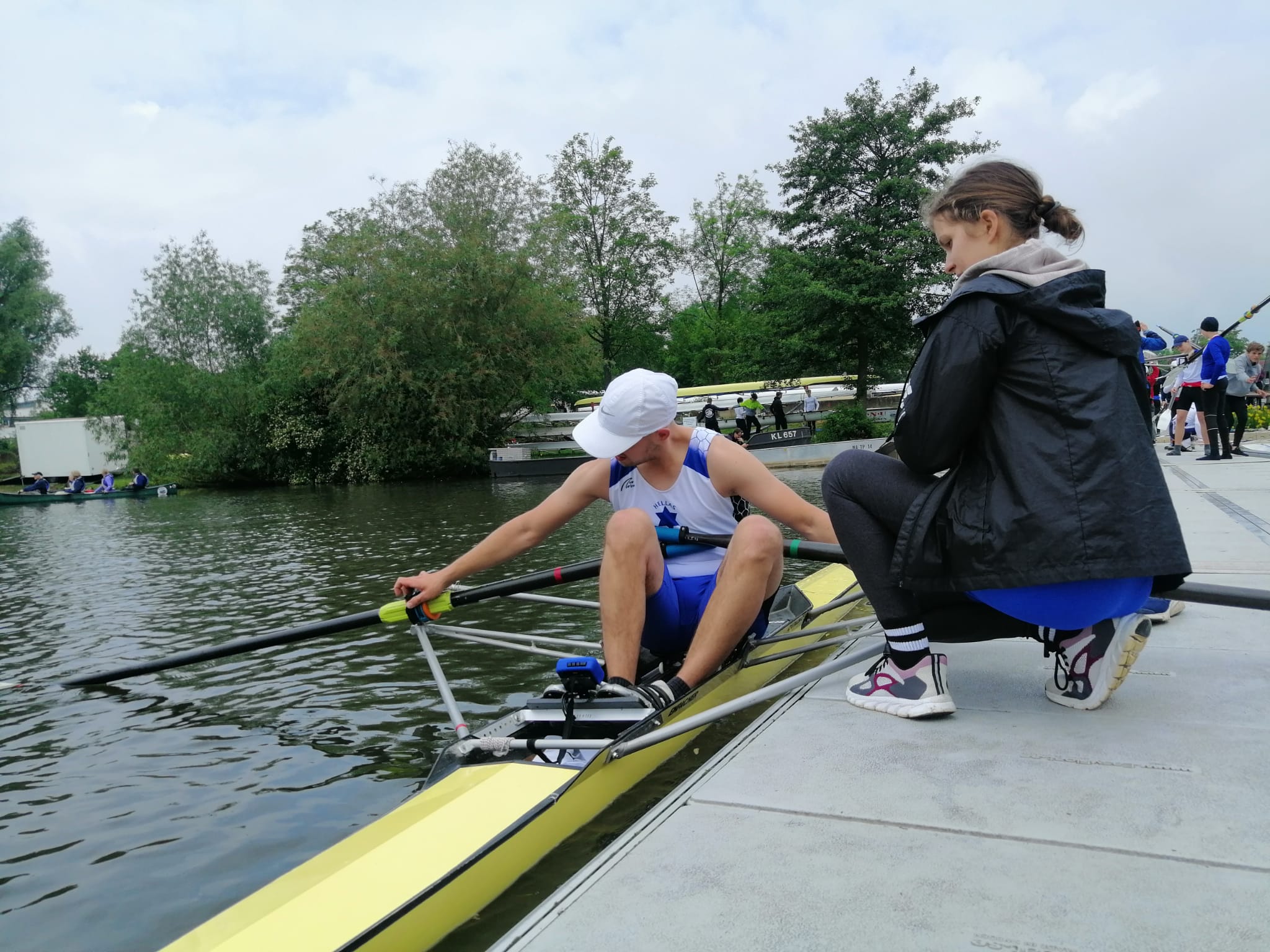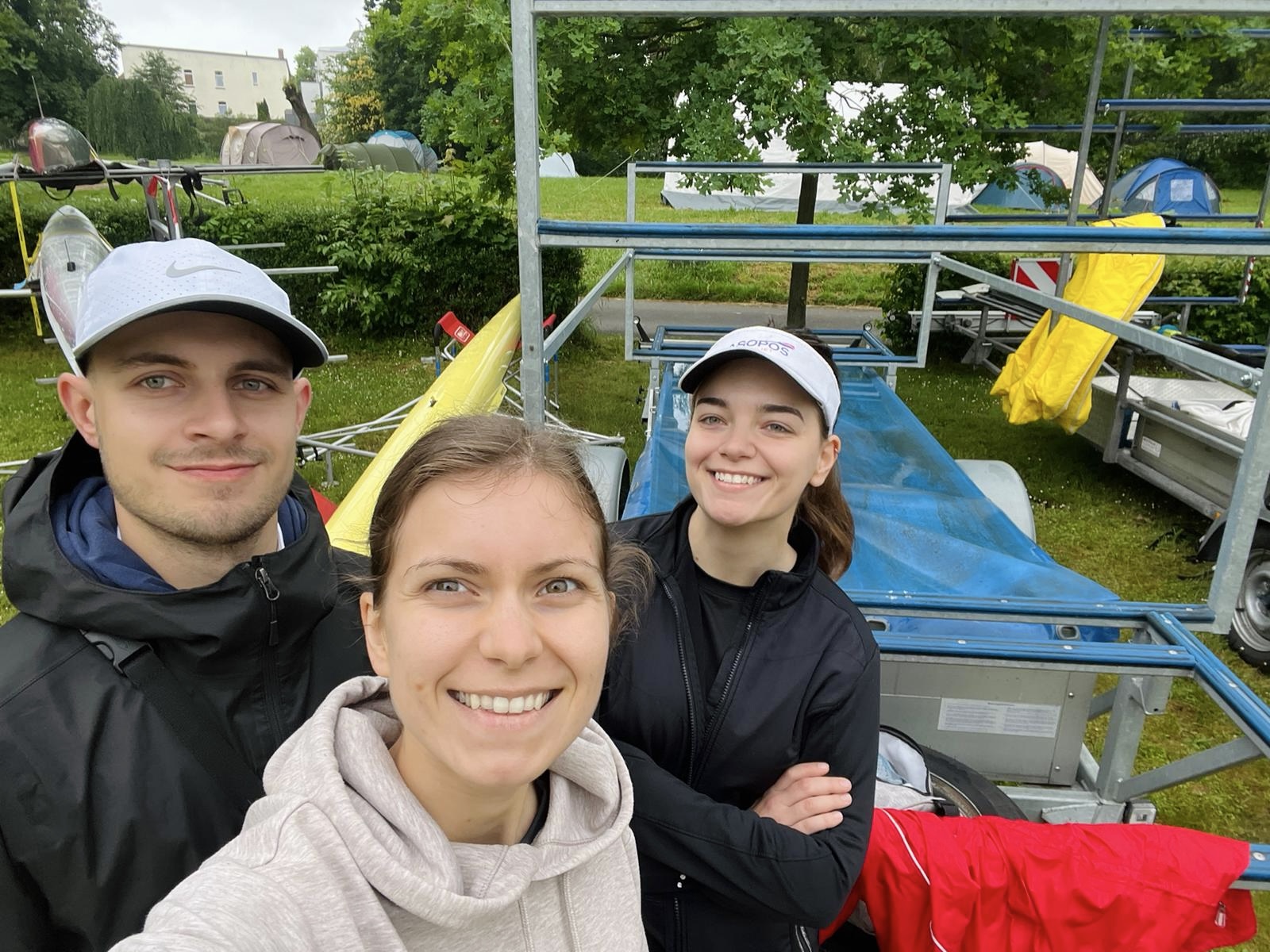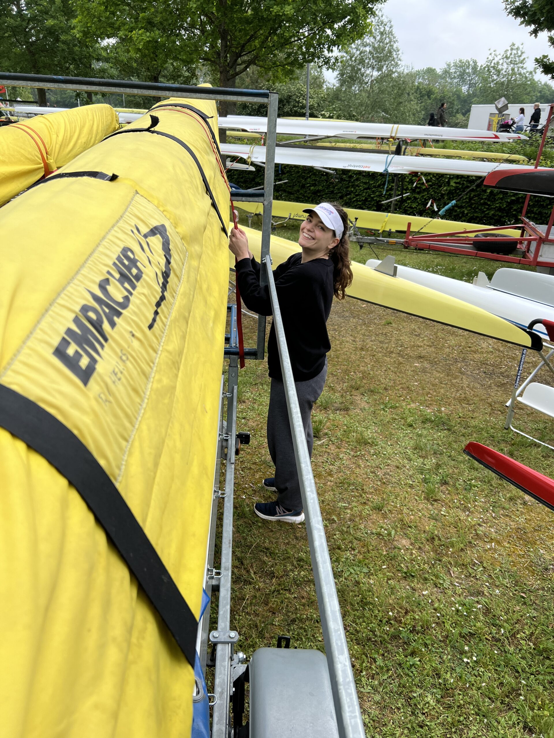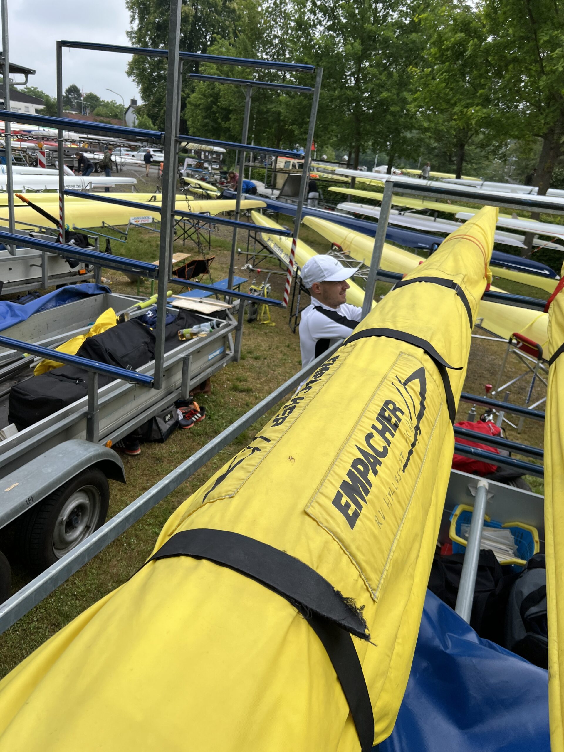 Wir stehen im Bootshaus und blicken auf den verregneten Vorplatz der Hellas. Keine Ruderer auf dem Wasser, der Verein wie ausgestorben. Nur der leere Anhänger wartet darauf, dass wir die abgeriggerten Boote drauflegen und es losgeht nach Gießen. Am Freitag, 17. Mai, haben wir erstmal den Hänger zum Regattaplatz an der Lahn gebracht.